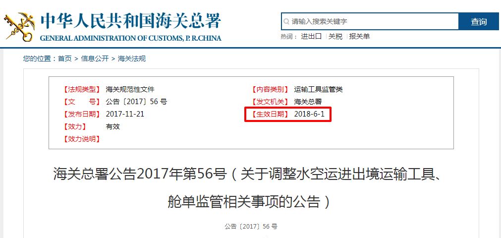 中國海關(guān)總署發(fā)布的第56號關(guān)于調(diào)整進(jìn)出口艙單監(jiān)管事項(xiàng)的規(guī)定將于2018年6月1日起實(shí)施。
